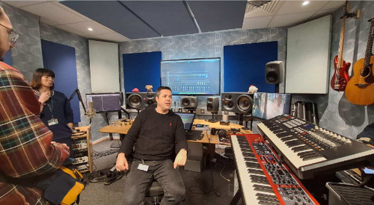 The tour of Yr Egin gave students a glimpse into live studios, editing suites, and the collaborative workspaces used by media professionals. The group met Steffan Rhys Williams, a music producer and composer who has contributed to S4C for more than 20 years. Steffan discussed the realities of composing for television, explaining how he sometimes outsources parts of the process so he can focus on creative direction.