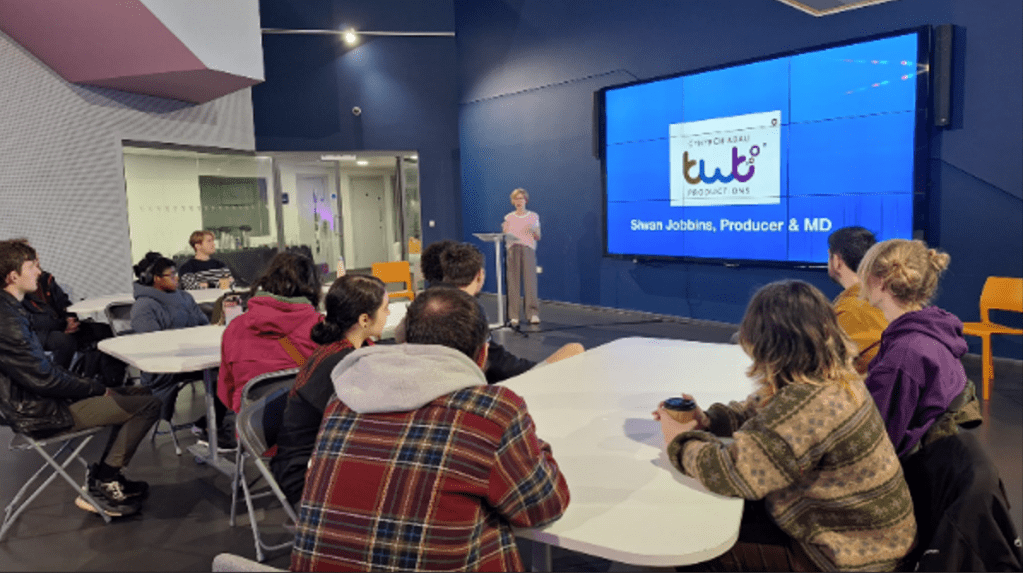 Students were given a useful roundup of upcoming festivals, networking events, and industry platforms—from the Cardiff Animation Festival to tender portals such as S4C Production Tenders, BBC Education Commissioning, and Sell2Wales. For graduates, Siwan encouraged maintaining momentum: keep learning, keep applying, and keep refining your skills. Early in your career, she explained, you may need to give up some rights to get your name out there, but as you gain experience you’ll have more influence and ownership over your work.