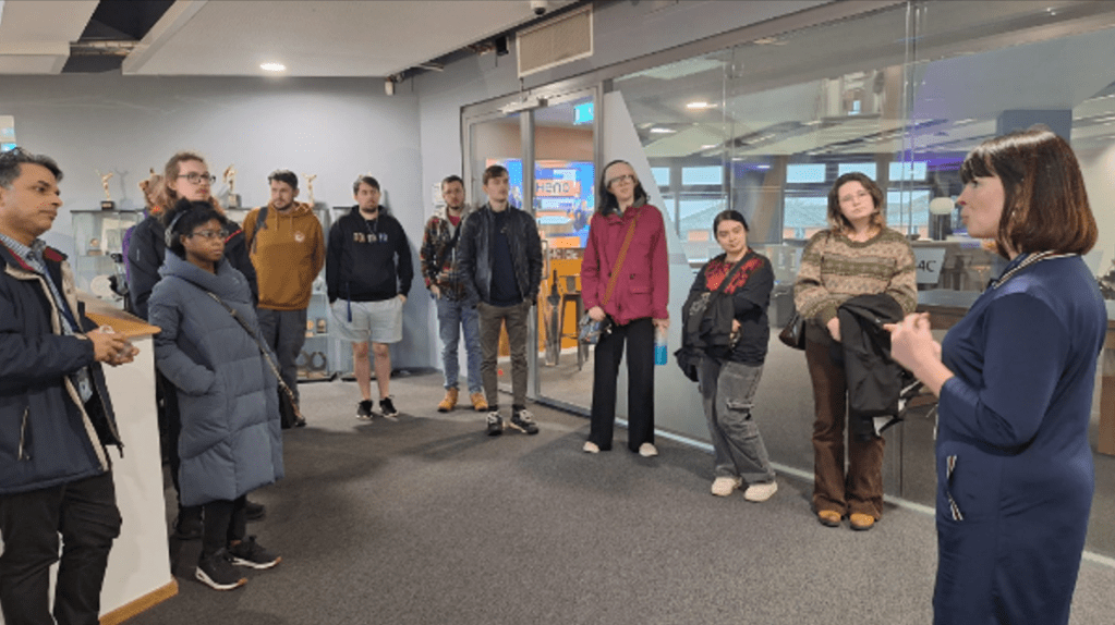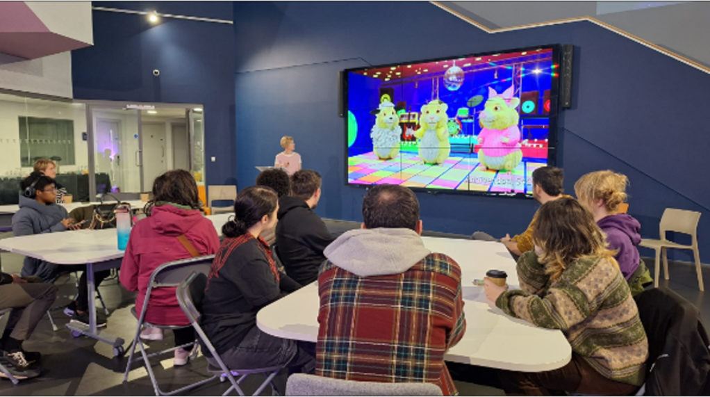 Recently, UWTSD Computing staff and students travelled to Yr Egin, the vibrant creative and digital centre based on the Carmarthen campus. Home to S4C, production companies, freelancers, and a growing community of digital talent, Yr Egin proved the perfect place for students to gain behind‑the‑scenes insights into animation, media production, education technology, and the realities of working in the creative industries. The day combined inspiring talks from industry professionals, a guided tour of S4C’s facilities, and an opportunity to see how creative ideas evolve from early sketches to polished on‑screen productions.
