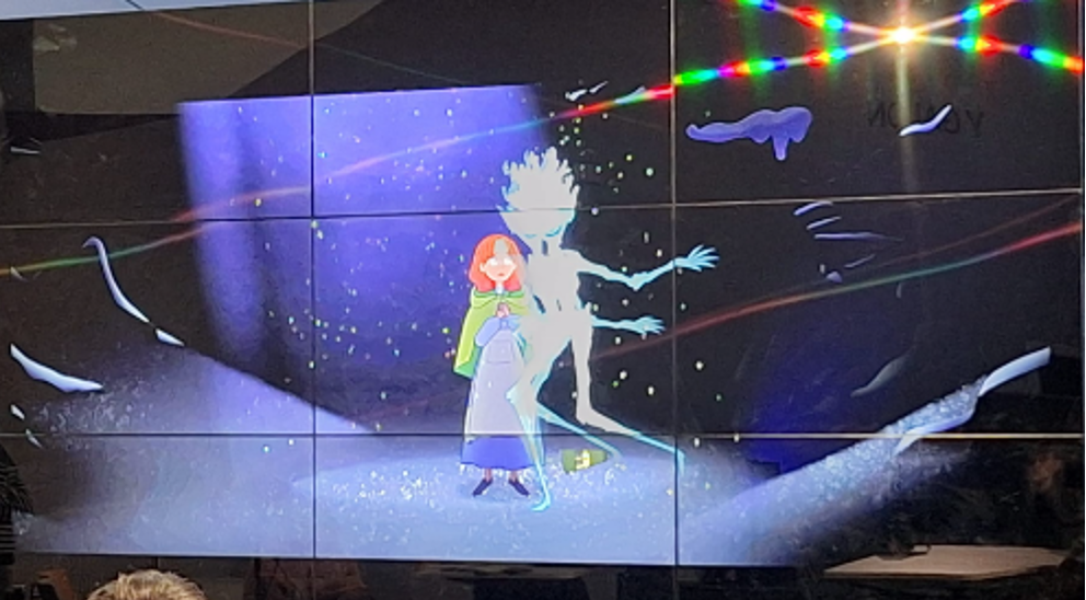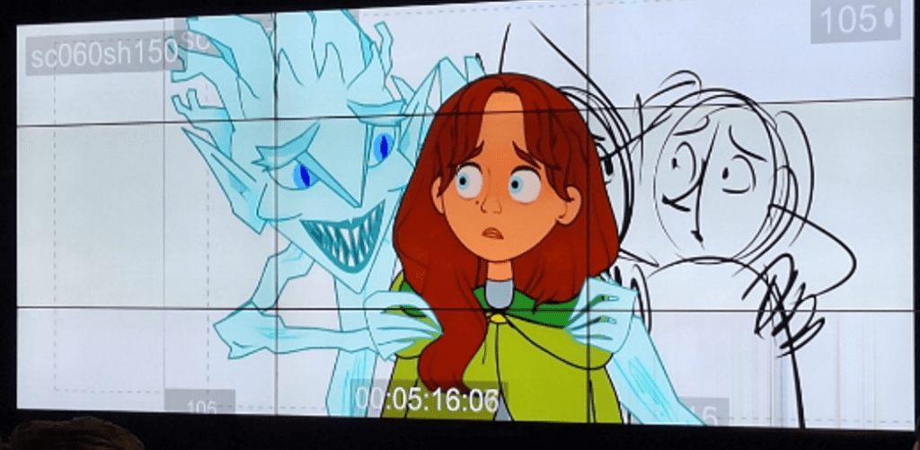 He also shared insights from his project “The Ghost of Midwinter / Ysbryd yr Oerfel,” a bilingual S4C Christmas animation produced in just six months. Students watched how a short sequence developed across four stages: from storyboards, to character animation, to effects, and finally to fully rendered backgrounds. It was a clear, fascinating demonstration of the full animation pipeline.
