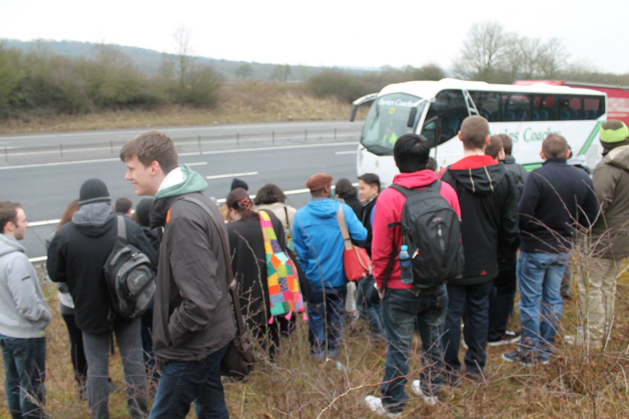 Things didn’t quite turn out as planned! We left just after 06:00, collected a student at Magor services and headed along the M4 to our planned break at Leigh Delaware services. But as we left the services and started to accelerate up to motorway speeds the coach refused to go into high gear. Oops! What turned out later to be a blown solenoid in the automatic transmission system left us all standing on the motorway embankment for an hour while we waited for a local coach to arrive to transport us to the next service station, where we would be met by another bus to take us on to our destination.