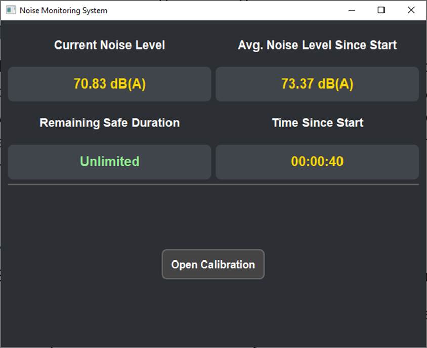 The GUI displays current noise levels, the average levels since starting, the time remaining before risk becomes high, and how long the app has been running. The system was built for under £20 and was tested with real users, receiving very positive feedback for its usability and clarity.