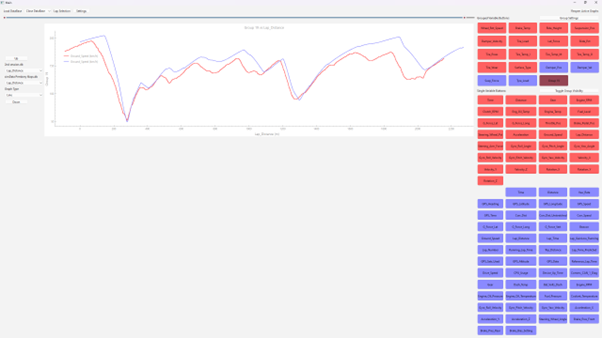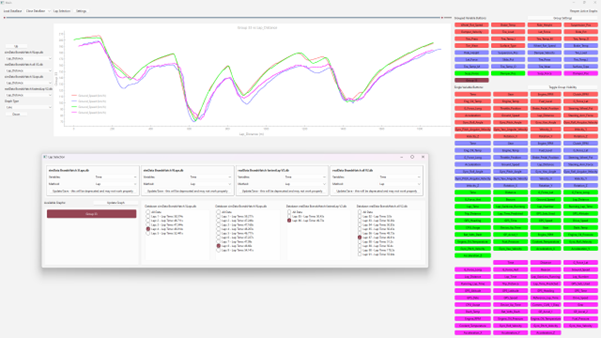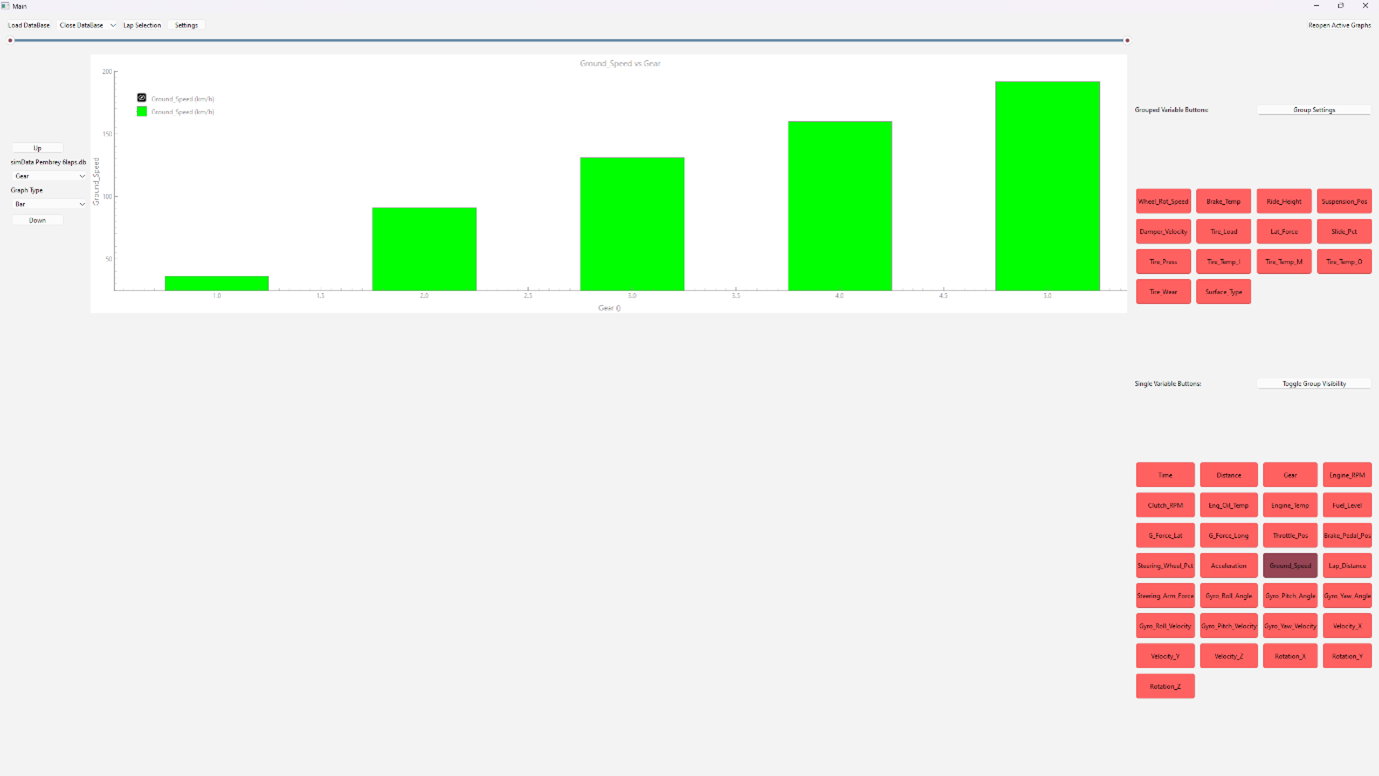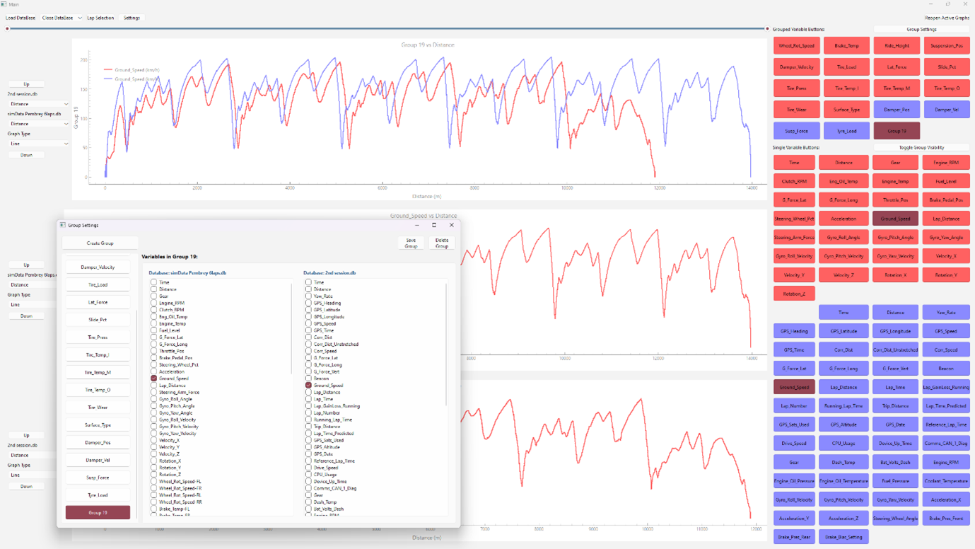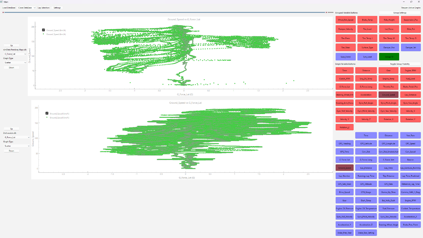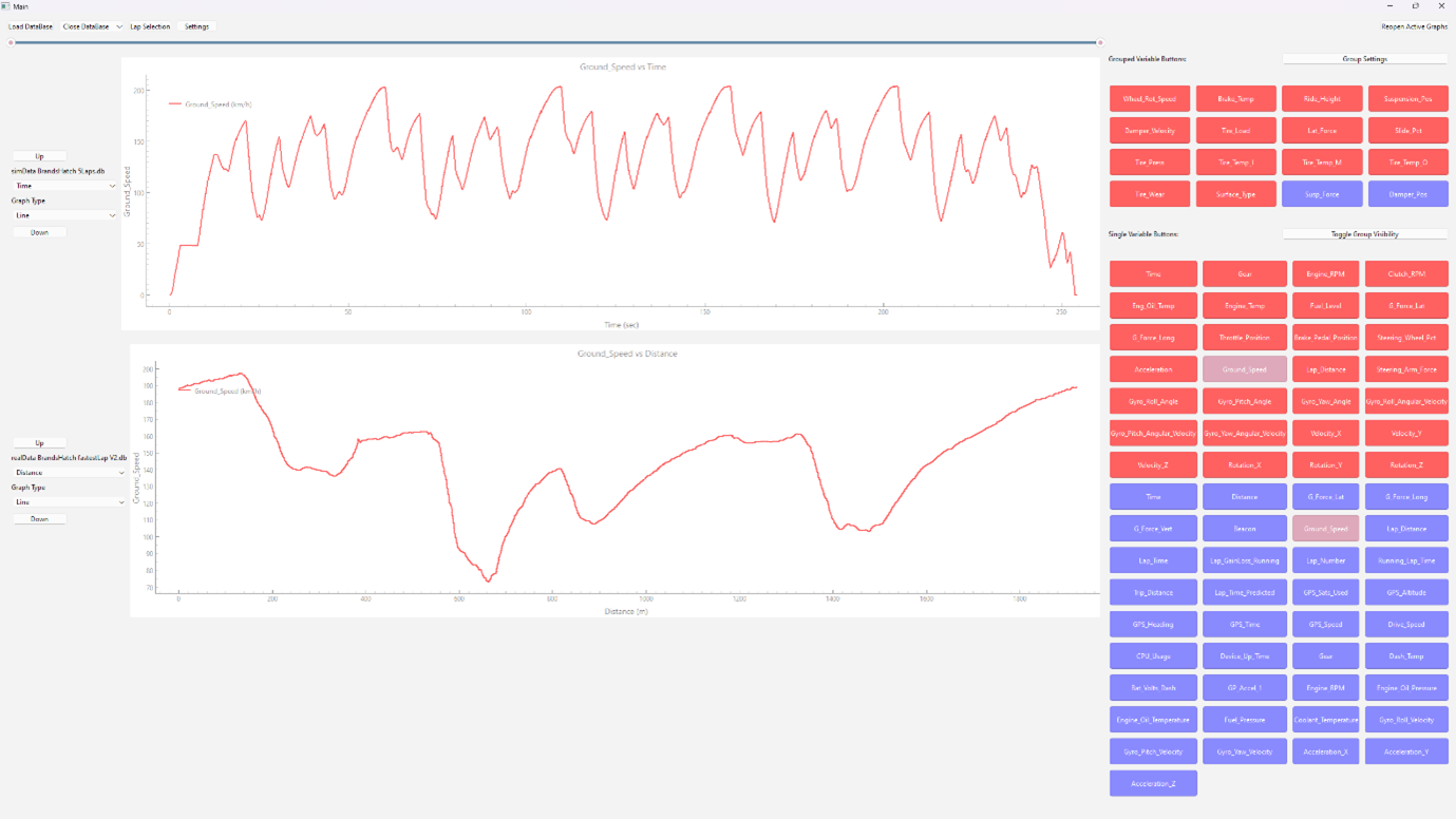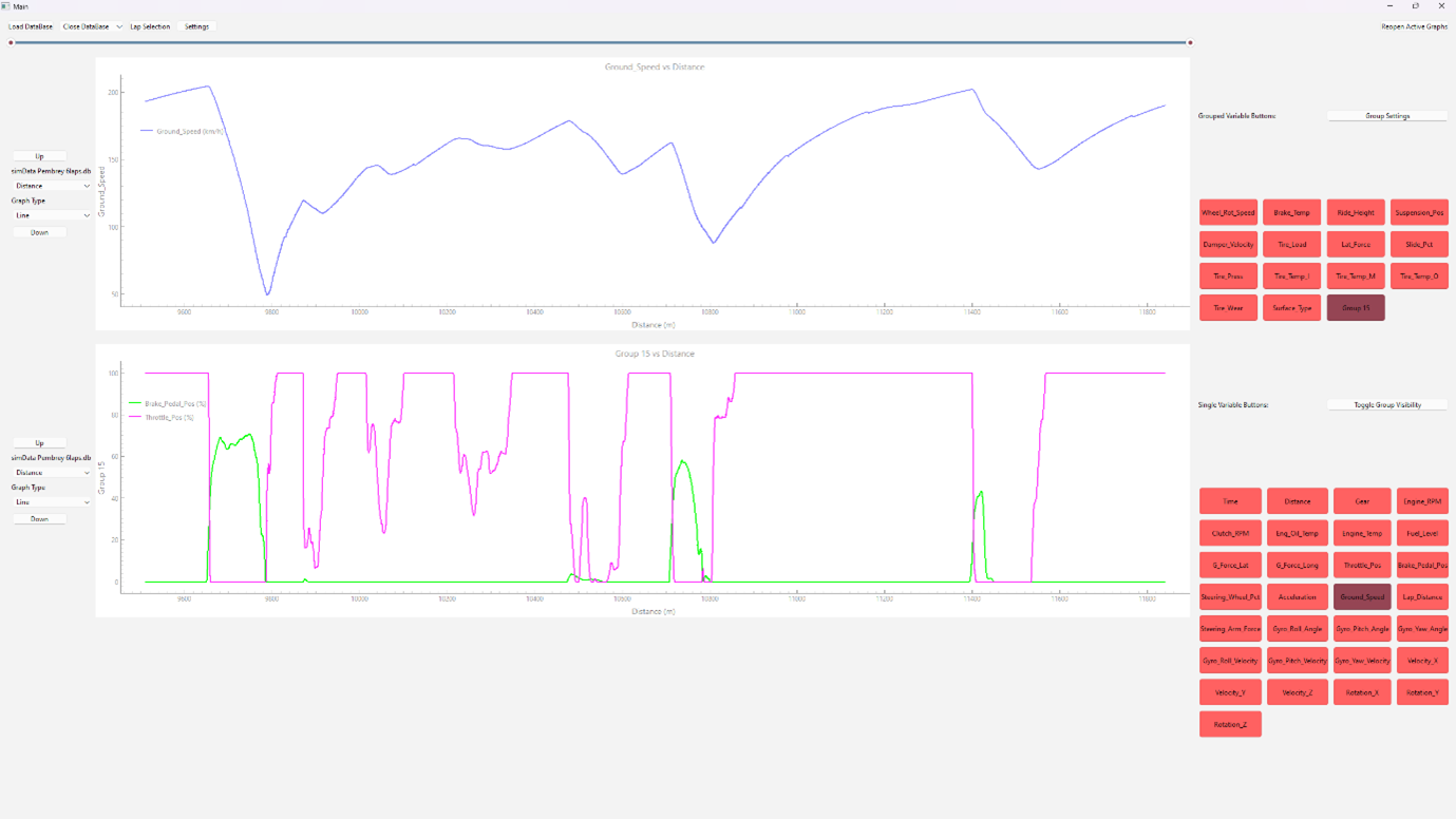The project’s program features include displaying data on various types of graphs (click below to enlarge), identifying and visualising specific laps from the data, being able to group similar data together and plotting them onto the same graph, and supporting multiple databases being loaded at the same time.