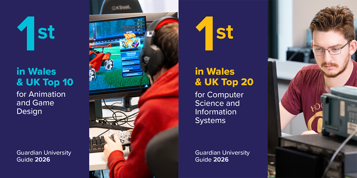 We’re thrilled to announce that in the Guardian University Guide 2026, our courses have ranked 1st in Wales & 9th in the UK for Animation & Games Design and 1st in Wales & 11th in the UK for Computer Science and Information Systems. 🎉🎊