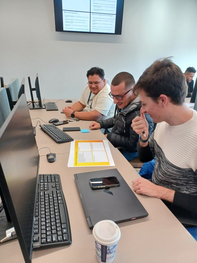 The Human Centric Design workshop provided students with a Challenge Statement: How can organisations harness Generative AI to create value for customers while preventing misinformation, bias, and intellectual property risks. It gave the students an opportunity to consider the introduction of AI into a company’s ecosystem and how they can work together to ideate and reach a consensus on what the key features and challenges are for ethical AI solutions.