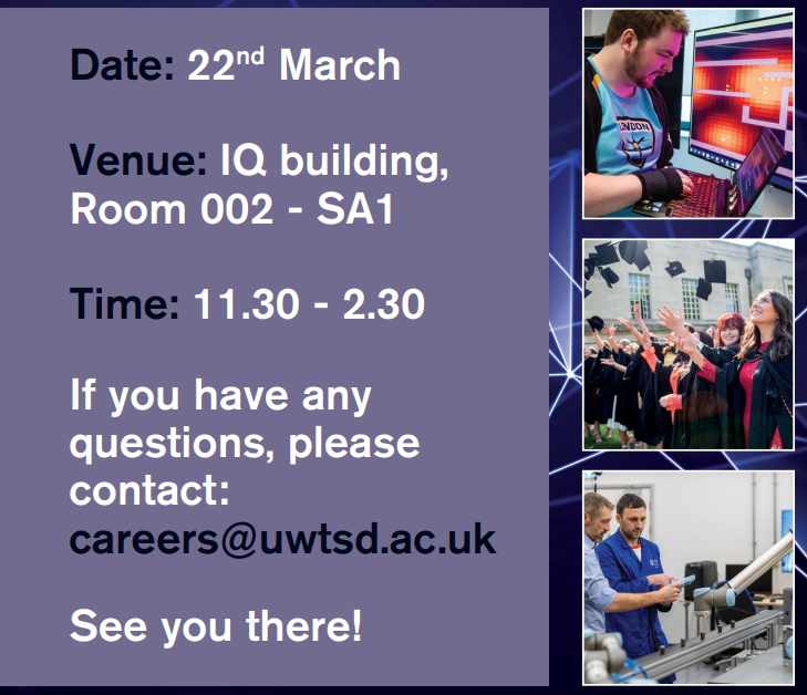 Date: 22nd March Venue: IQ building Room: 002 – SA1 Time: 11.30 – 2.30 If you have any questions, please contact: careers@uwtsd.ac.uk