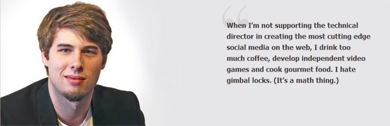 What aspects of your job do you enjoy most? I enjoy the Freedom I get with projects, the satisfaction of seeing my work online for millions to see and the free coffee my company offers.